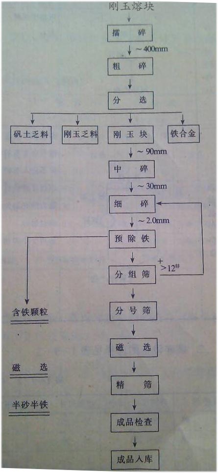 剛玉磨料的制粒加工是將冶煉合格的剛玉塊破碎為顆粒形態(tài),并按照一定的尺寸范圍分成各種不同的粒度同時分離出混雜在磨料中的鐵質(zhì),以滿足制作各種磨具及不同磨削要求之需求。